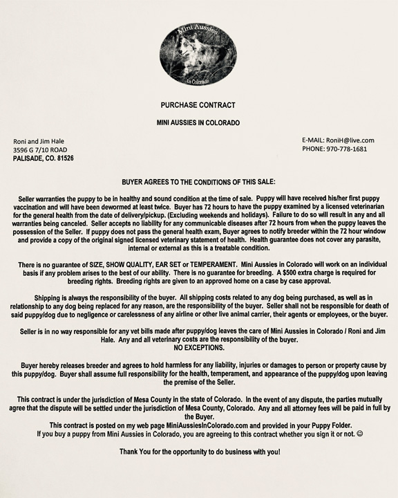 I am interested in getting a mini aussie in the next few months and I am just looking for the right place for us. We live in Fort Collins,Colorado, but are looking around the area for something that will fit distance and budget wise. We will be heading toward Grand Junction in September and I wondering if we might be able to set up a time to stop by and take a look at your set up. Any info would be much appreciated. Thanks!