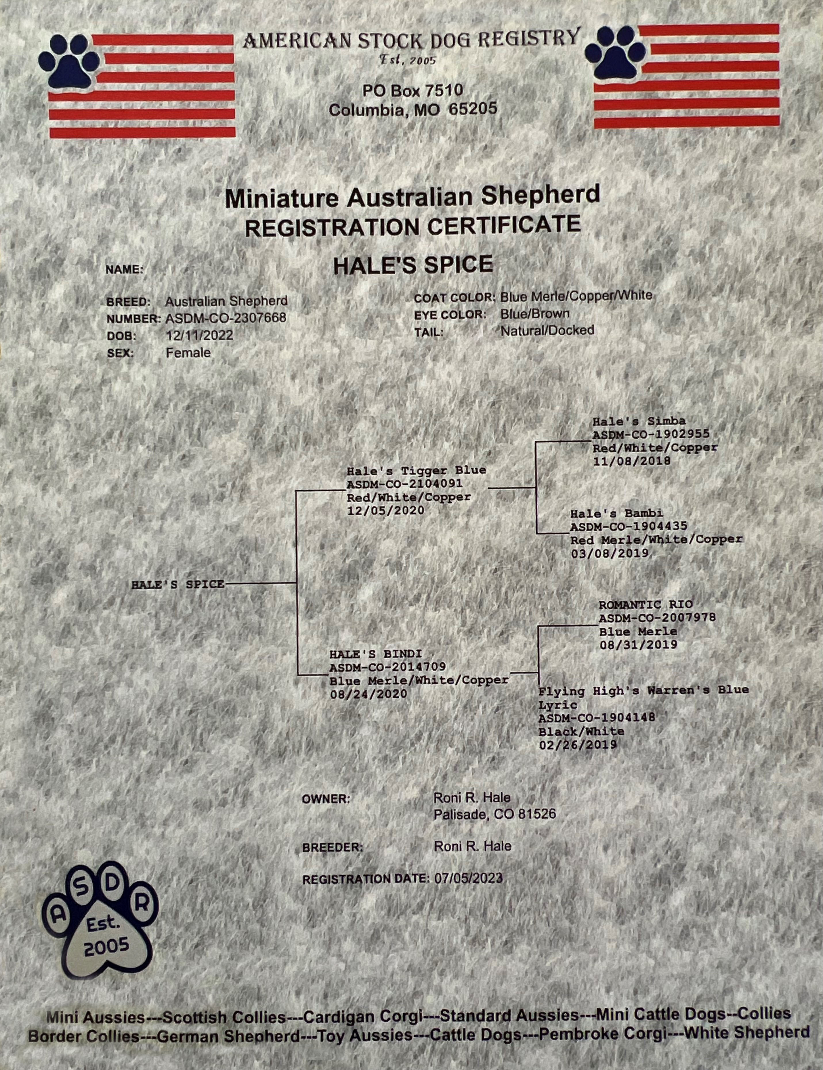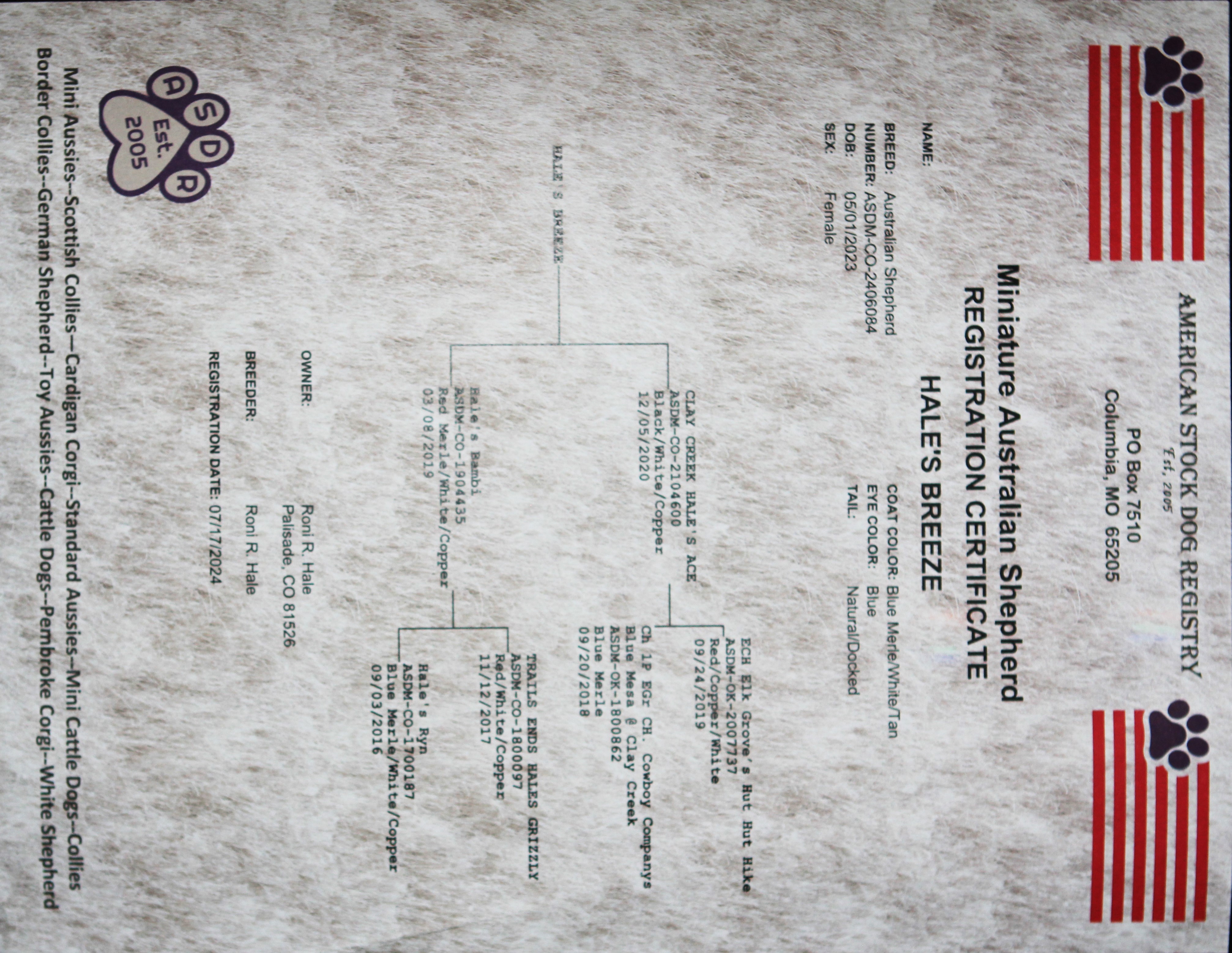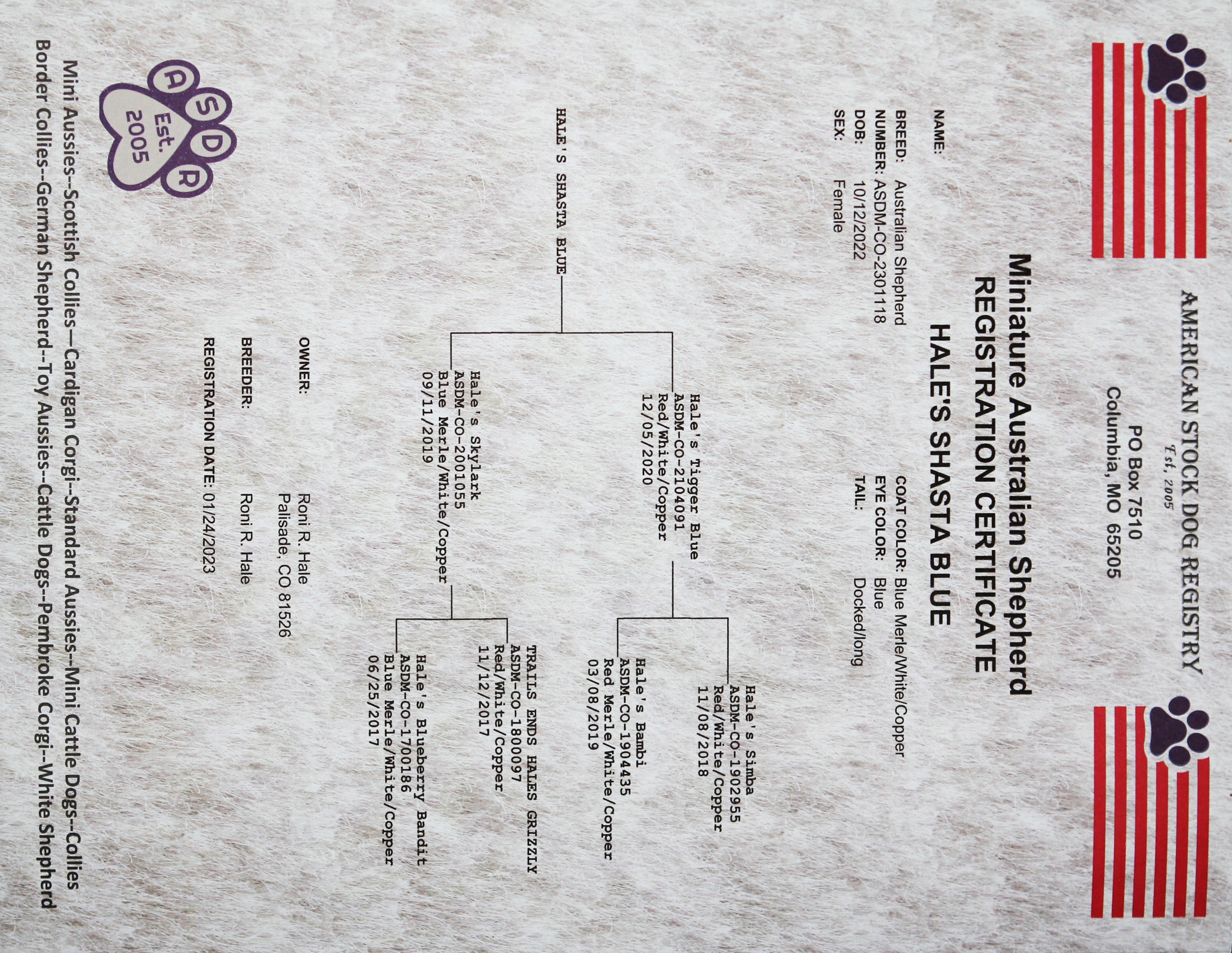 Halo is the daughter of Shasta & Ace. She is the perfect sized Mini at 23 lbs. We are expecting her to have her first litter in June of 2025! ASDR registered and DNA clear by parentage.