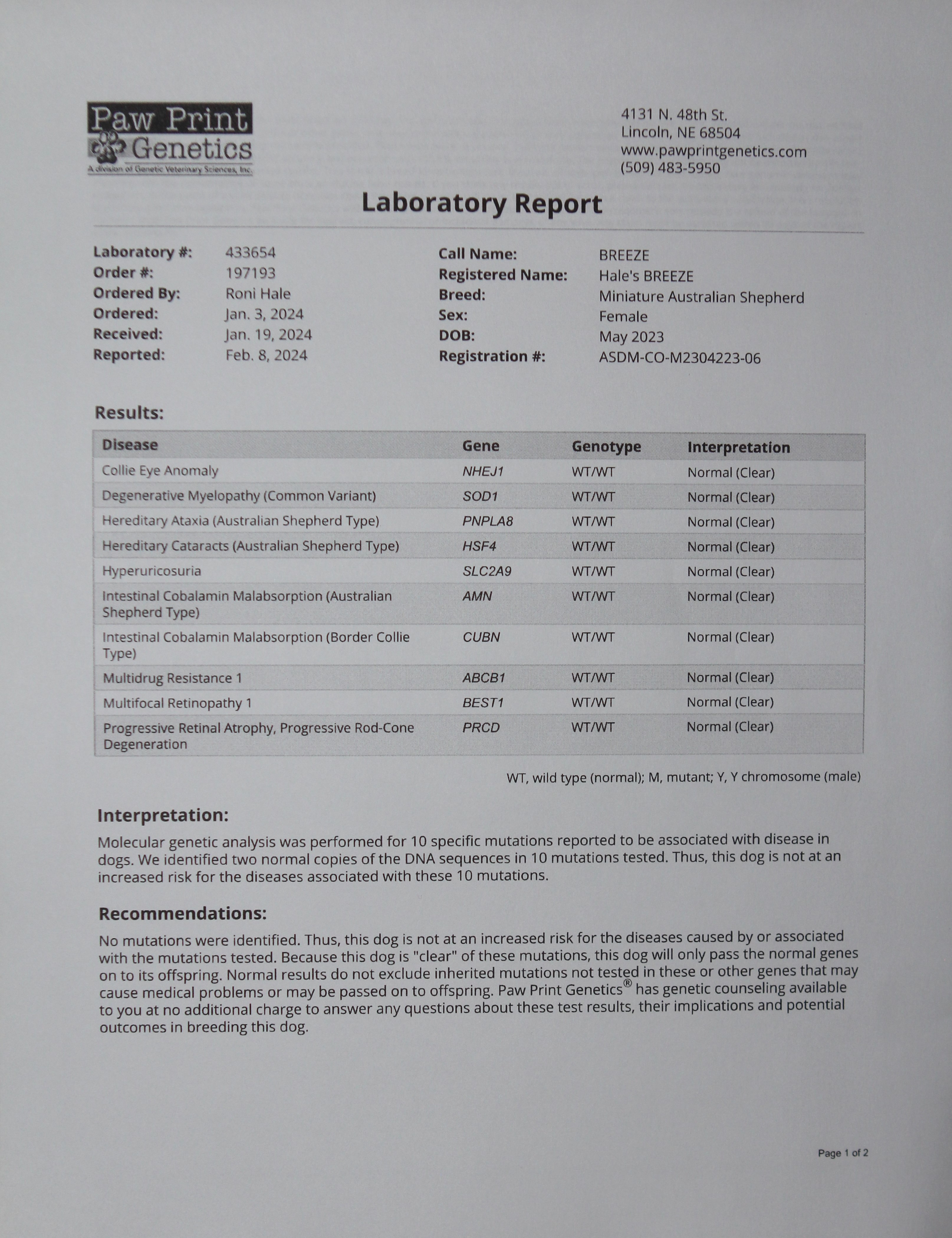 Breeze is a daughter of Bambi and Ace. She should weigh aprox. 30 lb. She is a stunning girl and we are excited to have her in our program! DNA clear full panels Paw Print Genetics. ASDR registered.