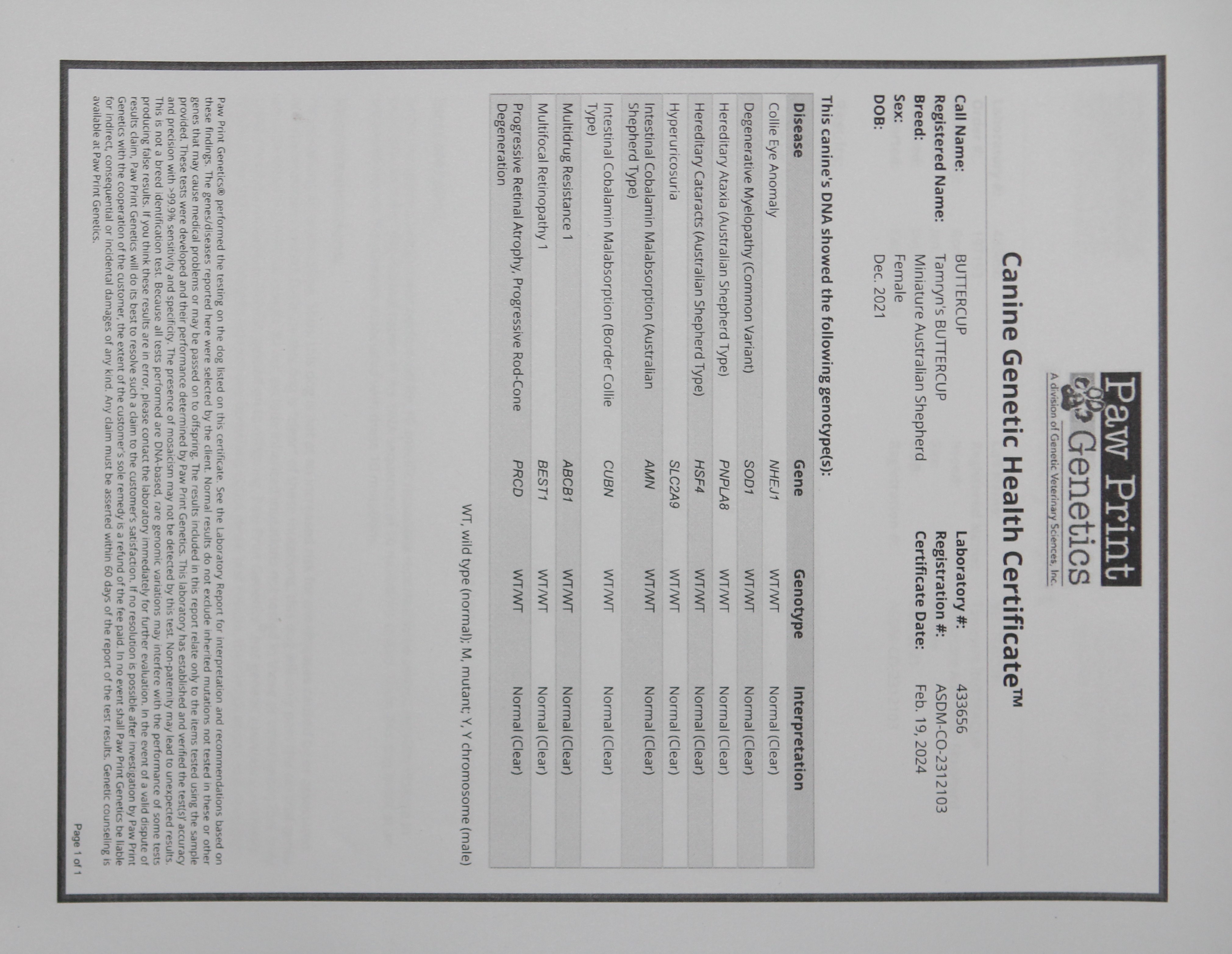 Buttercup is a daughter of  Ace and Angel. She is 26 lb. and 15″ from the shoulder. Buttercup is loyal and extremely intelligent. DNA clear full panels Paw Print Genetics. ASDR registered.