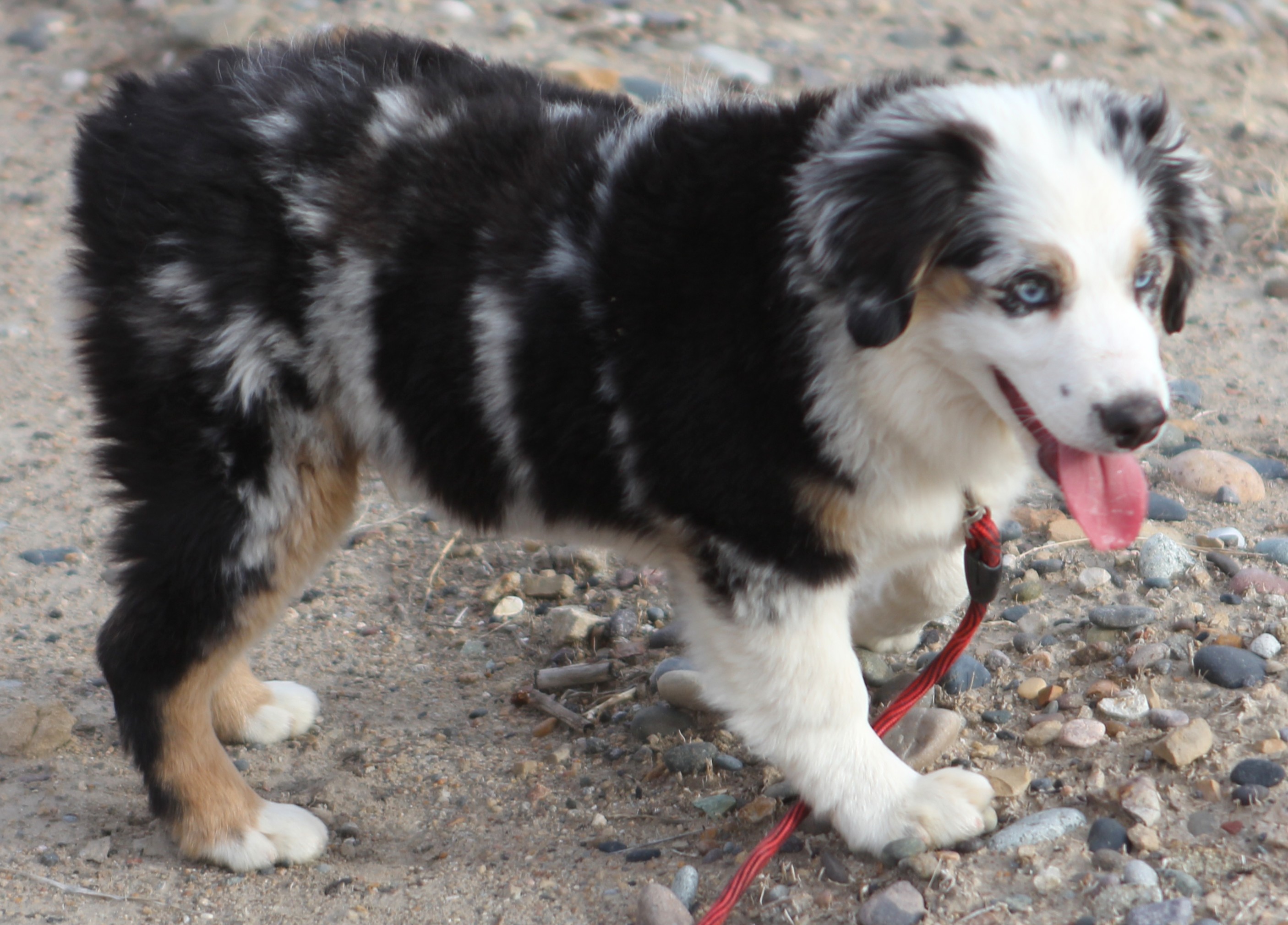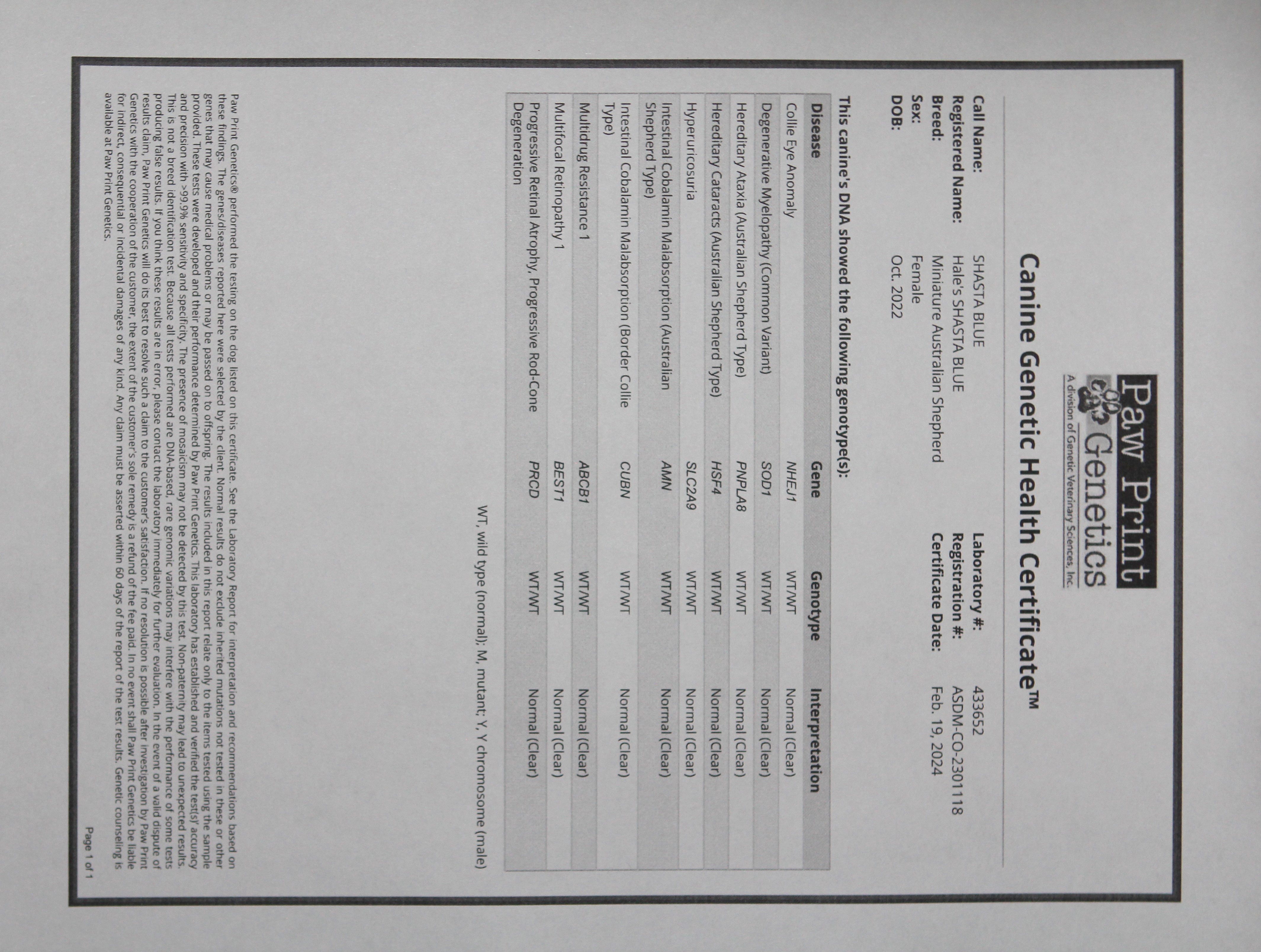 Shasta is a daughter of Skylark and Tigger. She weighs between 28 lb. 16″ from the shoulder. She is a perfect mix of her parents! Sweet and cuddly! DNA clear full panels Paw Print Genetics. ASDR registered.