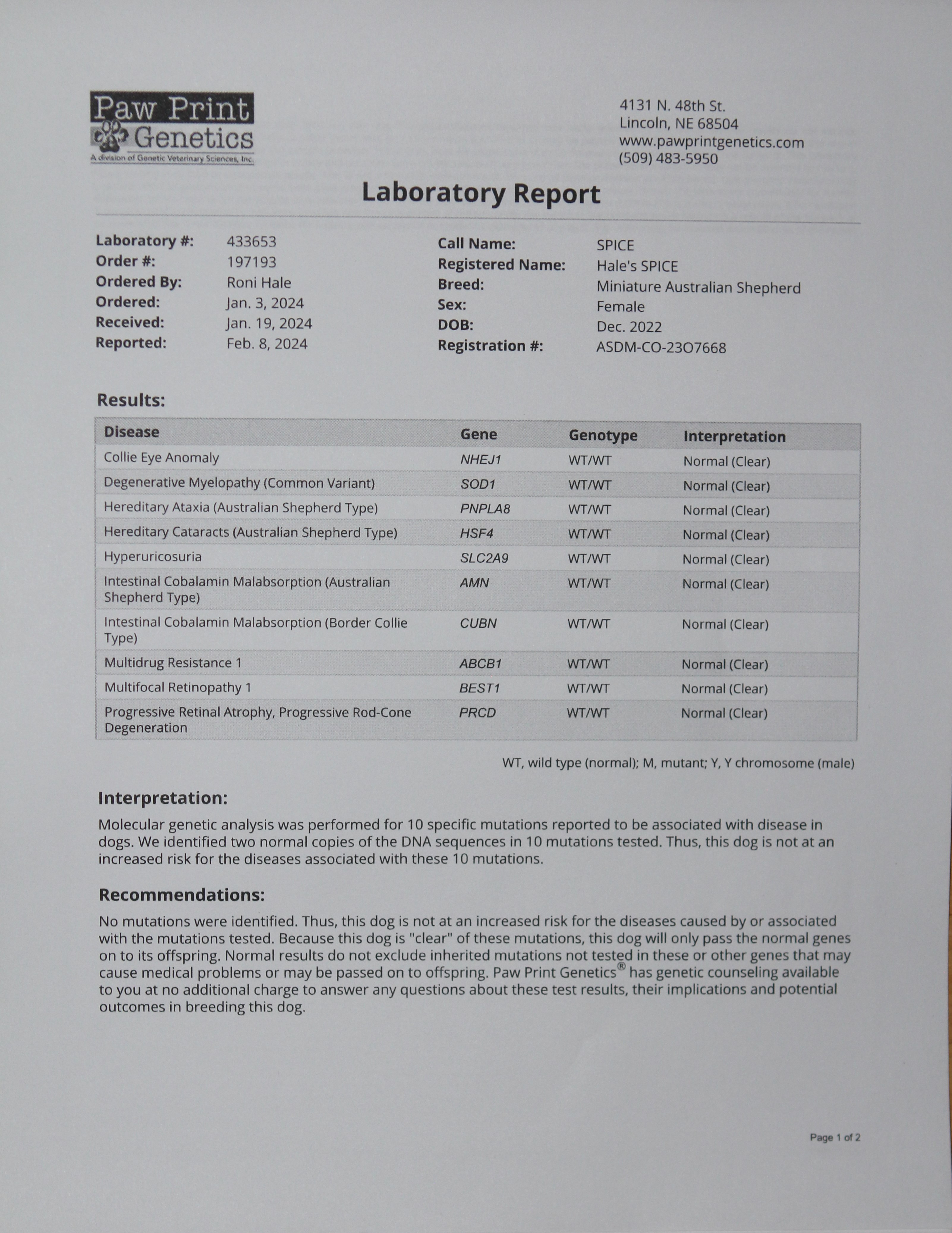 Spice is a daughter of Bindi and Tigger Blue. She is currently our smallest female weighing 19 lb. and 14″ from the shoulder. Spice is a tender hearted and sweet girl! DNA clear full panels Paw Print Genetics.  ASDR registered